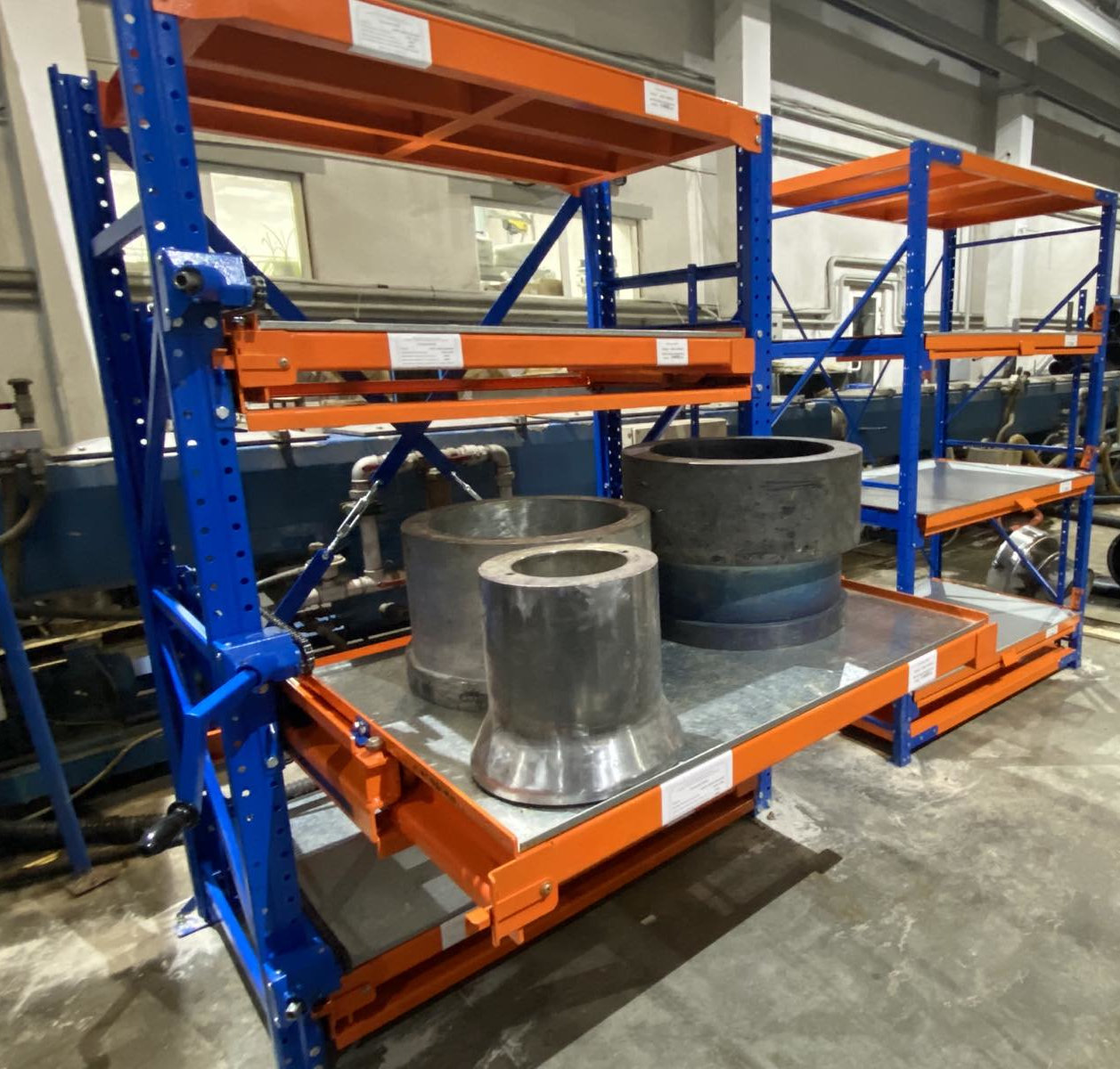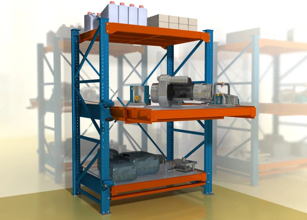 Стеллажи для хранения тяжелой оснастки, штампов и форм для литья с нагрузкой до 1400 кг. Встроенный механизм защиты от одновременного выдвижения уровней. Фиксация полок в выдвинутом и задвинутом состоянии.